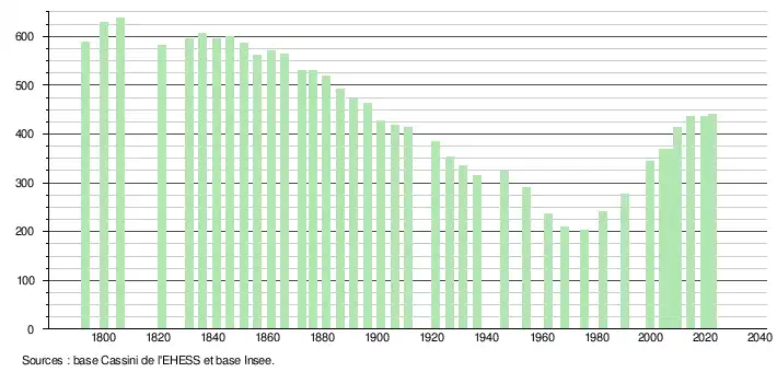 L'évolution du nombre d'habitants est connue à travers les recensements de la population effectués dans la commune depuis 1793. Pour les communes de moins de 10 000 habitants, une enquête de recensement portant sur toute la population est réalisée tous les cinq ans, les populations de référence des années intermédiaires étant quant à elles estimées par interpolation ou extrapolation[12]. Pour la commune, le premier recensement exhaustif entrant dans le cadre du nouveau dispositif a été réalisé en 2004[13].