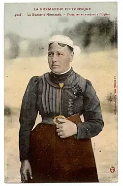 La bonnette, en Normandie, est caractérisée par le fait qu'elle se montre et qu'elle n'est pas cachée par les autres éléments de la coiffe. La bonnette normande est apparue à la fin du XVIIIe et au début du XIXe siècle. C'est l'accessoire du costume qui a été porté le plus longtemps, puisque son usage est attesté dans la Manche jusqu'à la veille de la Seconde Guerre mondiale. Les bonnettes normandes sont plutôt utilisées dans l'Ouest de la Normandie, dans la Manche et le Bessin. Elles succèdent aux grandes coiffes de cérémonies et aux coiffes à rencontre[1]. C'était un élément symbolique fort du régionalisme de l'époque.