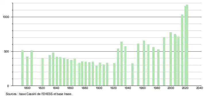- ↑ Population municipale de référence en vigueur au 1er janvier 2025, millésimée 2022, définie dans les limites territoriales en vigueur au 1er janvier 2024, date de référence statistique : 1er janvier 2022.
