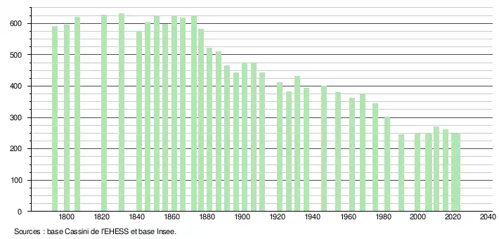 L'évolution du nombre d'habitants est connue à travers les recensements de la population effectués dans la commune depuis 1793. Pour les communes de moins de 10 000 habitants, une enquête de recensement portant sur toute la population est réalisée tous les cinq ans, les populations de référence des années intermédiaires étant quant à elles estimées par interpolation ou extrapolation[27]. Pour la commune, le premier recensement exhaustif entrant dans le cadre du nouveau dispositif a été réalisé en 2005[28].