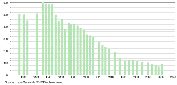 L'évolution du nombre d'habitants est connue à travers les recensements de la population effectués dans la commune depuis 1793. Pour les communes de moins de 10 000 habitants, une enquête de recensement portant sur toute la population est réalisée tous les cinq ans, les populations de référence des années intermédiaires étant quant à elles estimées par interpolation ou extrapolation[31]. Pour la commune, le premier recensement exhaustif entrant dans le cadre du nouveau dispositif a été réalisé en 2006[32].