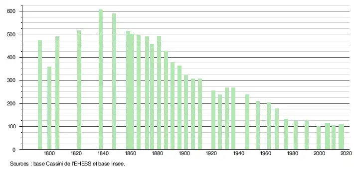L'évolution du nombre d'habitants est connue à travers les recensements de la population effectués dans la commune depuis 1793. Pour les communes de moins de 10 000 habitants, une enquête de recensement portant sur toute la population est réalisée tous les cinq ans, les populations de référence des années intermédiaires étant quant à elles estimées par interpolation ou extrapolation[4]. Pour la commune, le premier recensement exhaustif entrant dans le cadre du nouveau dispositif a été réalisé en 2005[5].
