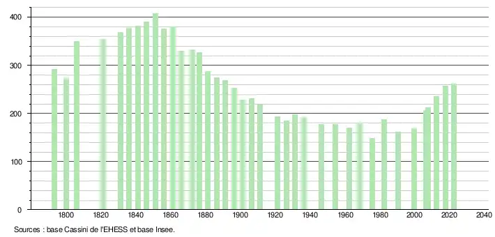L'évolution du nombre d'habitants est connue à travers les recensements de la population effectués dans la commune depuis 1793. Pour les communes de moins de 10 000 habitants, une enquête de recensement portant sur toute la population est réalisée tous les cinq ans, les populations de référence des années intermédiaires étant quant à elles estimées par interpolation ou extrapolation[22]. Pour la commune, le premier recensement exhaustif entrant dans le cadre du nouveau dispositif a été réalisé en 2007[23].