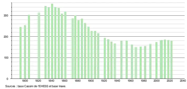 L'évolution du nombre d'habitants est connue à travers les recensements de la population effectués dans la commune depuis 1793. Pour les communes de moins de 10 000 habitants, une enquête de recensement portant sur toute la population est réalisée tous les cinq ans, les populations de référence des années intermédiaires étant quant à elles estimées par interpolation ou extrapolation[23]. Pour la commune, le premier recensement exhaustif entrant dans le cadre du nouveau dispositif a été réalisé en 2007[24].