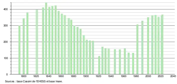 L'évolution du nombre d'habitants est connue à travers les recensements de la population effectués dans la commune depuis 1793. Pour les communes de moins de 10 000 habitants, une enquête de recensement portant sur toute la population est réalisée tous les cinq ans, les populations de référence des années intermédiaires étant quant à elles estimées par interpolation ou extrapolation[21]. Pour la commune, le premier recensement exhaustif entrant dans le cadre du nouveau dispositif a été réalisé en 2006[22].