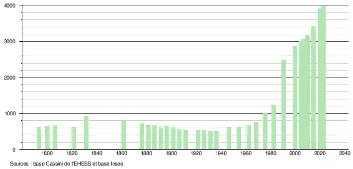 L'évolution du nombre d'habitants est connue à travers les recensements de la population effectués dans la commune depuis 1793. Pour les communes de moins de 10 000 habitants, une enquête de recensement portant sur toute la population est réalisée tous les cinq ans, les populations de référence des années intermédiaires étant quant à elles estimées par interpolation ou extrapolation[24]. Pour la commune, le premier recensement exhaustif entrant dans le cadre du nouveau dispositif a été réalisé en 2004[25].
