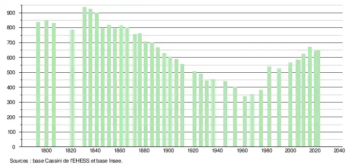 L'évolution du nombre d'habitants est connue à travers les recensements de la population effectués dans la commune depuis 1793. Pour les communes de moins de 10 000 habitants, une enquête de recensement portant sur toute la population est réalisée tous les cinq ans, les populations de référence des années intermédiaires étant quant à elles estimées par interpolation ou extrapolation[22]. Pour la commune, le premier recensement exhaustif entrant dans le cadre du nouveau dispositif a été réalisé en 2005[23].