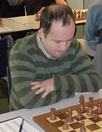 1. d4 Cf6 2. c4 g6 3. Cc3 d5 4. cxd5 Cxd5 5. e4 Cxc3 6. bxc3 Fg7 7. Fe3 c5 8. Dd2!?[3] cxd4 9. cxd4 Cc6 10. Td1 Fg4! 11. Fe2 Fxe2 12. Cxe2 0-0 13. 0-0 e6!? 14. d5 exd5 15. exd5 Ce5 16. Db4 Dd7 17. Db3?! (17. d6) Tfe8 18. h3 b5 19. Cd4 a6 20. Ff4 Cc4 21. Cc6 Te4! 22. Fg3? (22. Fb8!) Tae8 23. Cb4 Te2! Le reste de la partie est sans annotation : c'est un gain technique 24. Cxa6 Cd2 25. Cc5 Df5 26. Dd3 Dxd3 27. Cxd3 Cxf1 28. Rxf1 Txa2 29. Fc7 Ta1 30. Txa1 Fxa1 31. d6 Ff6 32. Cb4 Fc3 33. Cd3 Ta8 34. Cf4 Fe5 35. Cd5 Ta6 36. d7 Fxc7 37. Cxc7 Td6 38. Ce8 Td4 39. Re2 Rf8 40. Cf6 Re7 0-1.