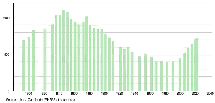 L'évolution du nombre d'habitants est connue à travers les recensements de la population effectués dans la commune depuis 1793. Pour les communes de moins de 10 000 habitants, une enquête de recensement portant sur toute la population est réalisée tous les cinq ans, les populations de référence des années intermédiaires étant quant à elles estimées par interpolation ou extrapolation[17]. Pour la commune, le premier recensement exhaustif entrant dans le cadre du nouveau dispositif a été réalisé en 2005[18].