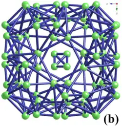 (a) Unité de 13 icosaèdres B12 ((B12)13 ou supericosaèdre), et (b) unité cluster de B80 de la structure de YB66. Le nombre excessif de liaisons (dans l'image 9B) résulte de l'hypothèse que tous les sites sont occupés, alors que le nombre total d'atome de bore est de seulement 42[11]. | ||
