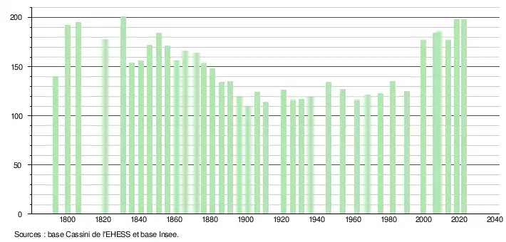 L'évolution du nombre d'habitants est connue à travers les recensements de la population effectués dans la commune depuis 1793. Pour les communes de moins de 10 000 habitants, une enquête de recensement portant sur toute la population est réalisée tous les cinq ans, les populations de référence des années intermédiaires étant quant à elles estimées par interpolation ou extrapolation[19]. Pour la commune, le premier recensement exhaustif entrant dans le cadre du nouveau dispositif a été réalisé en 2008[20].
