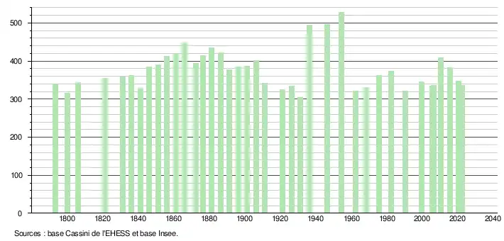 L'évolution du nombre d'habitants est connue à travers les recensements de la population effectués dans la commune depuis 1793. Pour les communes de moins de 10 000 habitants, une enquête de recensement portant sur toute la population est réalisée tous les cinq ans, les populations de référence des années intermédiaires étant quant à elles estimées par interpolation ou extrapolation[18]. Pour la commune, le premier recensement exhaustif entrant dans le cadre du nouveau dispositif a été réalisé en 2005[19].