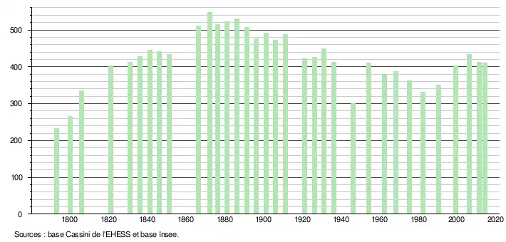 L'évolution du nombre d'habitants est connue à travers les recensements de la population effectués dans la commune depuis 1793. À partir du , les populations légales des communes sont publiées annuellement dans le cadre d'un recensement qui repose désormais sur une collecte d'information annuelle, concernant successivement tous les territoires communaux au cours d'une période de cinq ans. Pour les communes de moins de 10 000 habitants, une enquête de recensement portant sur toute la population est réalisée tous les cinq ans, les populations légales des années intermédiaires étant quant à elles estimées par interpolation ou extrapolation[6]. Pour la commune, le premier recensement exhaustif entrant dans le cadre du nouveau dispositif a été réalisé en 2006[7],[Note 1].