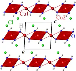 Les ions Cl− ont une coordination trigonale antiprismatique (3+3) de cuivre et d'hydrogène. Les ions Cu2+ sont situés sur deux sites non-équivalents, Cu1 et Cu2. Cu1 est en coordination octaédrique déformée (5+1) de groupes hydroxyles (OH) et de chlore, Cu2 est en coordination octaédrique déformée (4+2) d'OH et Cl. Les groupes octaédriques de cuivre sont reliés entre eux par leurs arêtes. |