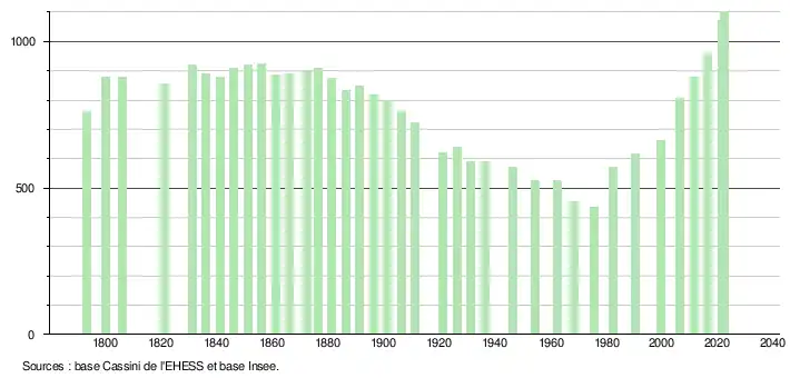 L'évolution du nombre d'habitants est connue à travers les recensements de la population effectués dans la commune depuis 1793. Pour les communes de moins de 10 000 habitants, une enquête de recensement portant sur toute la population est réalisée tous les cinq ans, les populations de référence des années intermédiaires étant quant à elles estimées par interpolation ou extrapolation[26]. Pour la commune, le premier recensement exhaustif entrant dans le cadre du nouveau dispositif a été réalisé en 2006[27].