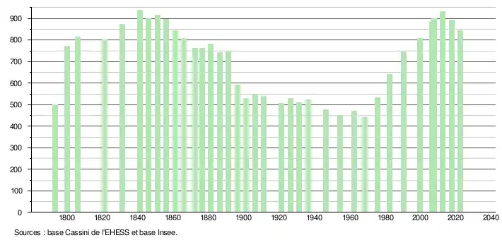 L'évolution du nombre d'habitants est connue à travers les recensements de la population effectués dans la commune depuis 1793. Pour les communes de moins de 10 000 habitants, une enquête de recensement portant sur toute la population est réalisée tous les cinq ans, les populations de référence des années intermédiaires étant quant à elles estimées par interpolation ou extrapolation[35]. Pour la commune, le premier recensement exhaustif entrant dans le cadre du nouveau dispositif a été réalisé en 2007[36].