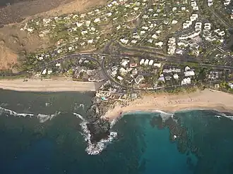 Vue aérienne de Boucan Canot avec le cap Boucan Canot au centre et la plage de Boucan Canot à droite.