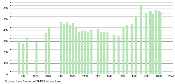 L'évolution du nombre d'habitants est connue à travers les recensements de la population effectués dans la commune depuis 1793. Pour les communes de moins de 10 000 habitants, une enquête de recensement portant sur toute la population est réalisée tous les cinq ans, les populations de référence des années intermédiaires étant quant à elles estimées par interpolation ou extrapolation[20]. Pour la commune, le premier recensement exhaustif entrant dans le cadre du nouveau dispositif a été réalisé en 2005[21].