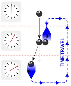 Un lien de causalité en boucle existe alors dans l'espace-temps, mais son origine ne peut être déterminée[1],[2]. Un exemple théorisé d'une boucle de causalité est donné par une boule de billard frappant ses dernières versions : la boule de billard se déplace en suivant un certain itinéraire vers une machine à voyager dans le temps, et la même boule de billard future sort de la machine à voyager dans le temps avant que sa version passée ne soit entrée dans la machine, donnant à sa version passée un coup oblique, altérant la trajectoire passée de la boule et faisant en sorte qu'elle entre dans la machine temporelle avec un angle qui va provoquer que sa version future frappe sa version passée avec le même coup oblique qui a altéré son chemin[5].