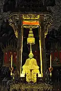 La statue est présentée sur un piédestal en or, au sommet d'un autel de 11 m de haut, dans une cage de verre (la photographier est interdit) et sous un parasol doré à neuf étages symbolisant la royauté universelle.