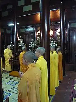 Trois offices sont pratiqués régulièrement à l'aube, à midi et au crépuscule. Ils comprennent la lecture de sutras avec niệm Phật et la récitation de dhāraṇī et kinh hành (la méditation en marchant). Des laïcs se joignent parfois aux services au temple et des fidèles bouddhistes pratiquent les offices chez eux. Des services spéciaux tels que Sam Nguyen/Sam Hoi (confession - repentance) ont lieu lors de la pleine lune et la nouvelle lune de chaque mois. La pratique de Niệm Phật est une façon de se repentir et de purifier le mauvais karma.