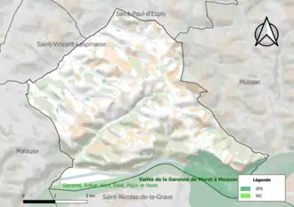 L’inventaire des zones naturelles d'intérêt écologique, faunistique et floristique (ZNIEFF) a pour objectif de réaliser une couverture des zones les plus intéressantes sur le plan écologique, essentiellement dans la perspective d’améliorer la connaissance du patrimoine naturel national et de fournir aux différents décideurs un outil d’aide à la prise en compte de l’environnement dans l’aménagement du territoire. Deux ZNIEFF de type 1[Note 3] sont recensées sur la commune[18] : « la Garonne de Montréjeau jusqu'à Lamagistère » (5 075 ha), couvrant 92 communes dont 63 dans la Haute-Garonne, trois dans le Lot-et-Garonne et 26 dans le Tarn-et-Garonne[19], et la « terrasse de Boudou » (244 ha), couvrant 2 communes du département[20] et deux ZNIEFF de type 2[Note 4],[18] :