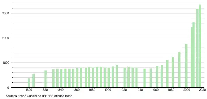 L'évolution du nombre d'habitants est connue à travers les recensements de la population effectués dans la commune depuis 1800. Pour les communes de moins de 10 000 habitants, une enquête de recensement portant sur toute la population est réalisée tous les cinq ans, les populations de référence des années intermédiaires étant quant à elles estimées par interpolation ou extrapolation[13]. Pour la commune, le premier recensement exhaustif entrant dans le cadre du nouveau dispositif a été réalisé en 2008[14].