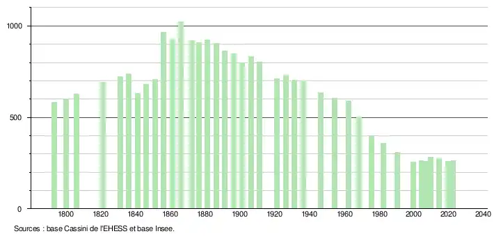 L'évolution du nombre d'habitants est connue à travers les recensements de la population effectués dans la commune depuis 1793. Pour les communes de moins de 10 000 habitants, une enquête de recensement portant sur toute la population est réalisée tous les cinq ans, les populations de référence des années intermédiaires étant quant à elles estimées par interpolation ou extrapolation[33]. Pour la commune, le premier recensement exhaustif entrant dans le cadre du nouveau dispositif a été réalisé en 2004[34].