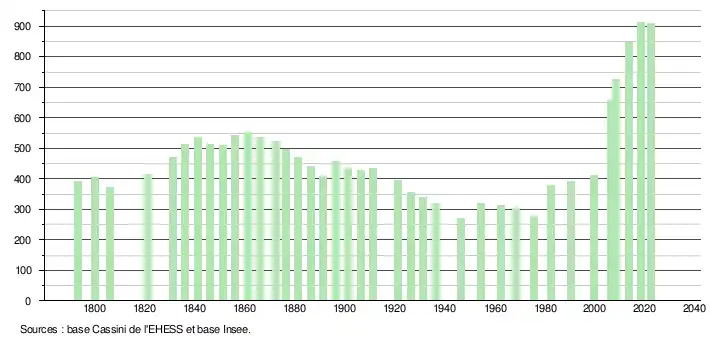 L'évolution du nombre d'habitants est connue à travers les recensements de la population effectués dans la commune depuis 1793. Pour les communes de moins de 10 000 habitants, une enquête de recensement portant sur toute la population est réalisée tous les cinq ans, les populations de référence des années intermédiaires étant quant à elles estimées par interpolation ou extrapolation[8]. Pour la commune, le premier recensement exhaustif entrant dans le cadre du nouveau dispositif a été réalisé en 2008[9].