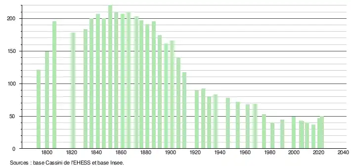 L'évolution du nombre d'habitants est connue à travers les recensements de la population effectués dans la commune depuis 1793. Pour les communes de moins de 10 000 habitants, une enquête de recensement portant sur toute la population est réalisée tous les cinq ans, les populations de référence des années intermédiaires étant quant à elles estimées par interpolation ou extrapolation[12]. Pour la commune, le premier recensement exhaustif entrant dans le cadre du nouveau dispositif a été réalisé en 2005[13].