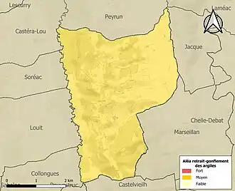 Le retrait-gonflement des sols argileux est susceptible d'engendrer des dommages importants aux bâtiments en cas d’alternance de périodes de sécheresse et de pluie. La totalité de la commune est en aléa moyen ou fort (44,5 % au niveau départemental et 48,5 % au niveau national). Sur les 60 bâtiments dénombrés sur la commune en 2019, 60 sont en aléa moyen ou fort, soit 100 %, à comparer aux 75 % au niveau départemental et 54 % au niveau national. Une cartographie de l'exposition du territoire national au retrait gonflement des sols argileux est disponible sur le site du BRGM[16],[Carte 2].