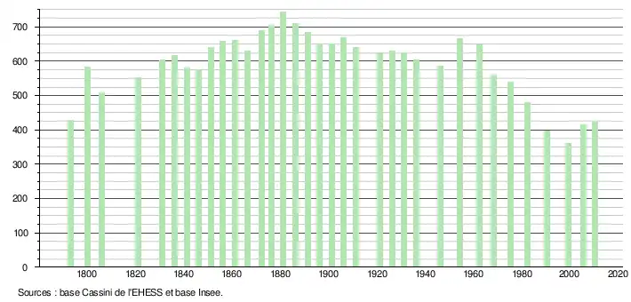 L'évolution du nombre d'habitants est connue à travers les recensements de la population effectués dans la commune depuis 1793. À partir du , les populations légales des communes sont publiées annuellement dans le cadre d'un recensement qui repose désormais sur une collecte d'information annuelle, concernant successivement tous les territoires communaux au cours d'une période de cinq ans. Pour les communes de moins de 10 000 habitants, une enquête de recensement portant sur toute la population est réalisée tous les cinq ans, les populations légales des années intermédiaires étant quant à elles estimées par interpolation ou extrapolation[2]. Pour la commune, le premier recensement exhaustif entrant dans le cadre du nouveau dispositif a été réalisé en 2005[3],[Note 1].