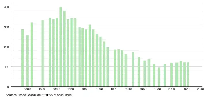 L'évolution du nombre d'habitants est connue à travers les recensements de la population effectués dans la commune depuis 1793. Pour les communes de moins de 10 000 habitants, une enquête de recensement portant sur toute la population est réalisée tous les cinq ans, les populations de référence des années intermédiaires étant quant à elles estimées par interpolation ou extrapolation[48]. Pour la commune, le premier recensement exhaustif entrant dans le cadre du nouveau dispositif a été réalisé en 2007[49].