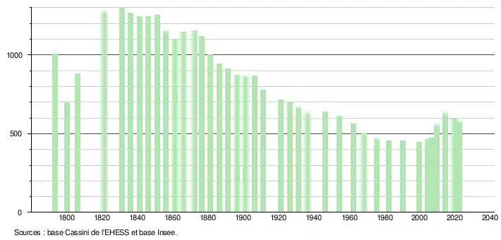 L'évolution du nombre d'habitants est connue à travers les recensements de la population effectués dans la commune depuis 1793. Pour les communes de moins de 10 000 habitants, une enquête de recensement portant sur toute la population est réalisée tous les cinq ans, les populations de référence des années intermédiaires étant quant à elles estimées par interpolation ou extrapolation[29]. Pour la commune, le premier recensement exhaustif entrant dans le cadre du nouveau dispositif a été réalisé en 2004[30].