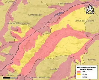 Le retrait-gonflement des sols argileux est susceptible d'engendrer des dommages importants aux bâtiments en cas d’alternance de périodes de sécheresse et de pluie. La totalité de la commune est en aléa moyen ou fort (92 % au niveau départemental et 48,5 % au niveau national). Sur les 292 bâtiments dénombrés sur la commune en 2019, 292 sont en aléa moyen ou fort, soit 100 %, à comparer aux 96 % au niveau départemental et 54 % au niveau national. Une cartographie de l'exposition du territoire national au retrait gonflement des sols argileux est disponible sur le site du BRGM[24],[Carte 3].