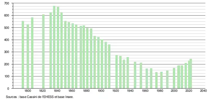 L'évolution du nombre d'habitants est connue à travers les recensements de la population effectués dans la commune depuis 1793. Pour les communes de moins de 10 000 habitants, une enquête de recensement portant sur toute la population est réalisée tous les cinq ans, les populations de référence des années intermédiaires étant quant à elles estimées par interpolation ou extrapolation[13]. Pour la commune, le premier recensement exhaustif entrant dans le cadre du nouveau dispositif a été réalisé en 2005[14].