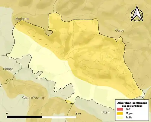 Les communes les plus proches[Note 2] sont[4] : Uzan (1,6 km), Géus-d'Arzacq (2,2 km), Garos (2,6 km), Géus-d'Arzacq (2,9 km), Pomps (3,3 km), Piets-Plasence-Moustrou (3,4 km), Morlanne (3,4 km), Fichous-Riumayou (4,4 km).
