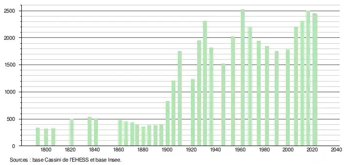 L'évolution du nombre d'habitants est connue à travers les recensements de la population effectués dans la commune depuis 1793. Pour les communes de moins de 10 000 habitants, une enquête de recensement portant sur toute la population est réalisée tous les cinq ans, les populations de référence des années intermédiaires étant quant à elles estimées par interpolation ou extrapolation[26]. Pour la commune, le premier recensement exhaustif entrant dans le cadre du nouveau dispositif a été réalisé en 2006[27].