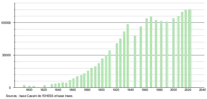 ↑ Par convention dans Wikipédia, le principe a été retenu de n’afficher dans le tableau des recensements et le graphique, pour les populations de référence postérieures à 1999, que les populations correspondant à une enquête exhaustive de recensement pour les communes de moins de 10000habitants, et que les populations des années 2006, 2011, 2016, etc. pour les communes de plus de 10000habitants, ainsi que la dernière population de référence publiée par l’Insee pour l'ensemble des communes.