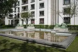 Immeuble 5 rue Denfert-Rochereau construit en 1934 par Georges-Henri Pingusson. Sur la gauche, la grille barre l'accès à la voie privée allée des Pins.
