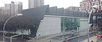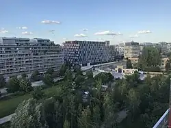 Le quartier Billancourt - Rives de Seine (anciennement Billancourt) est situé en bordure sud-ouest de la ville près de l'île Seguin (l'Île fait 12,3ha)[47]. L'ancienne ferme fut aménagée au XIXesiècle par le baron de Gourcuff, promoteur de l'époque, en un quartier citadin. Les immeubles et les maisonnettes en brique côtoyaient les pavillons de plaisance, les maisonnettes de cultivateurs, et les guinguettes dans lesquelles se rendaient les Parisiens le dimanche. Le quartier a ensuite abrité sur la quasi-totalité de sa superficie, les usines Renault avec 31,5ha (11,5ha Île Seguin et 4haMeudon soit 47ha avant démolition)[48]. Vers 2003[49] les terrains Renault ont débuté leur mutation, mais les difficultés à trouver des projets stables pour l'île Seguin retardent le processus. On retrouve, au nord-ouest du quartier, le Pont de Sèvres, important lieu de transit entre Paris et sa banlieue. Vers 2003 à vers 2016, une zone de 34,4ha[50] est modifiée dont 2,93ha parc de Billancourt[51]. Autour se trouve la plus grande cité HLM de Boulogne-Billancourt, classée quartier prioritaire[52], et comportant 1 258 logements sociaux (auxquels on peut ajouter les 774 logements des résidences Aquitaine, Bretagne, Île-de-France et Normandie[réf.nécessaire]). Le quartier comporte aussi le parc des Glacières et sa piscine-patinoire municipale, ainsi que le marché de Billancourt.