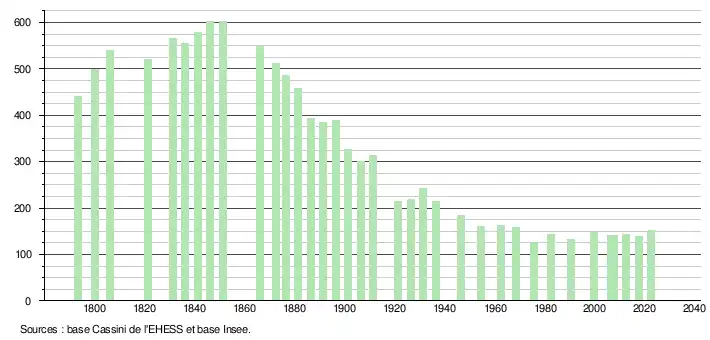 L'évolution du nombre d'habitants est connue à travers les recensements de la population effectués dans la commune depuis 1793. Pour les communes de moins de 10 000 habitants, une enquête de recensement portant sur toute la population est réalisée tous les cinq ans, les populations de référence des années intermédiaires étant quant à elles estimées par interpolation ou extrapolation[20]. Pour la commune, le premier recensement exhaustif entrant dans le cadre du nouveau dispositif a été réalisé en 2007[21].
