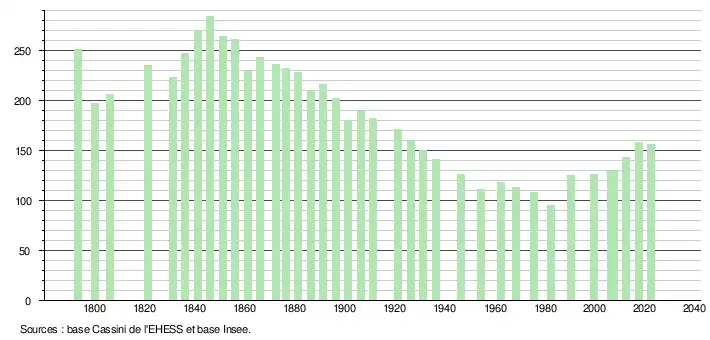 L'évolution du nombre d'habitants est connue à travers les recensements de la population effectués dans la commune depuis 1793. Pour les communes de moins de 10 000 habitants, une enquête de recensement portant sur toute la population est réalisée tous les cinq ans, les populations de référence des années intermédiaires étant quant à elles estimées par interpolation ou extrapolation[37]. Pour la commune, le premier recensement exhaustif entrant dans le cadre du nouveau dispositif a été réalisé en 2007[38].