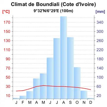 Le climat, qualifié de « climat soudanais »[Note 3], est tropical sec de savane, classé de type As (Classification de Köppen). Ce climat chaud se caractérise par une très longue saison sèche, d'octobre à mai et une saison des pluies marquée par deux maxima pluviométriques, l'un en juin et l'autre en septembre. Pendant la saison des pluies, les précipitations peuvent se prolonger pendant une semaine sans interruption, ou tomber violemment pendant quelques heures avant que le soleil ne réapparaisse. On compte en moyenne 77 jours de pluie par an dans le département de Boundiali, le total des précipitations annuelles se situent autour des 1 300 à 1 500 mm[4]. Les températures varient peu, allant de 21 à 35 °C[5],[6]. En mai, la température de l’air avoisine les 32 °C. En janvier et février, les mois les plus froids, l'harmattan, un vent puissant venu du Sahara abaisse considérablement la température qui se situe toutefois toujours aux alentours de 20 °C. Il arrive parfois que des vents de sable, issus du désert malien, atteignent la région et la recouvrent d'une couleur ocre.