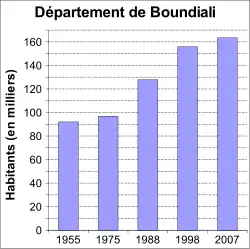 Beaucoup de jeunes hommes seront également soustraits de leur village et enrôlés de force dans les régiments de tirailleurs sénégalais pour participer aux conflits sur les territoires européen, indochinois et algérien[28], [29], [30], [Note 16]. De retour au pays, les survivants, minoritaires, sont devenus des anciens combattants dont la pension, bien que faible et longtemps « cristallisée », et qui a très récemment été revalorisée à la suite du succès en France du film Indigènes[31], a fait vivre des familles entières dans les villages du département, phénomène qui, par la force des choses, est en train de s'estomper : 3014 pensions militaires ou retraites du combattant (montant annuel : 467 euros en 2008) concernaient la Côte d'Ivoire en 1998[32], [33], [34]. Il est vrai que beaucoup d'habitants du département vivent avec 15 000 Francs CFA mensuels, soit environ 25 euros (moins de 1 euro par jour), parfois même avec moins[Note 17],[35]... L'écrivain Ahmadou Kourouma, né à Boundiali en 1927, a ainsi servi en Indochine pendant quatre ans : tirailleur sénégalais gradé, il avait refusé de participer avec son bataillon à la répression des luttes du PDCI-RDA ; il se vit donc dégradé, emprisonné et désigné d’office pour l’Indochine[Note 18], [36]