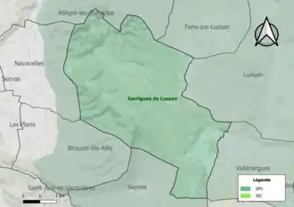 L’inventaire des zones naturelles d'intérêt écologique, faunistique et floristique (ZNIEFF) a pour objectif de réaliser une couverture des zones les plus intéressantes sur le plan écologique, essentiellement dans la perspective d’améliorer la connaissance du patrimoine naturel national et de fournir aux différents décideurs un outil d’aide à la prise en compte de l’environnement dans l’aménagement du territoire. Deux ZNIEFF de type 1[Note 2] sont recensées sur la commune[13] : les « rochers de St-Peyre et d'Aiguières » (171 ha), couvrant 3 communes du département[14], et la « serre du Mont Bouquet » (497 ha), couvrant 3 communes du département[15] et une ZNIEFF de type 2[Note 3],[13] : le « plateau de Lussan et Massifs Boisés » (37 159 ha), couvrant 40 communes du département[16].