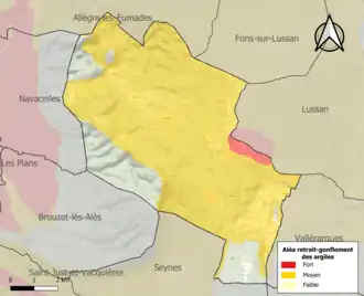 La commune est vulnérable au risque de mouvements de terrains constitué principalement du retrait-gonflement des sols argileux[24]. Cet aléa est susceptible d'engendrer des dommages importants aux bâtiments en cas d’alternance de périodes de sécheresse et de pluie. 82,8 % de la superficie communale est en aléa moyen ou fort (67,5 % au niveau départemental et 48,5 % au niveau national). Sur les 160 bâtiments dénombrés sur la commune en 2019, 157 sont en aléa moyen ou fort, soit 98 %, à comparer aux 90 % au niveau départemental et 54 % au niveau national. Une cartographie de l'exposition du territoire national au retrait gonflement des sols argileux est disponible sur le site du BRGM[25],[Carte 2].