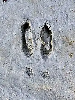 Le bouquetin se déplace généralement au pas, même si on le sait capable de galoper très rapidement jusqu'à 50 km/h et faire des pointes avoisinant les 70 km/h[1]. La marque de ses pieds est plus large et plus longue que chez le chamois : les pinces sont légèrement recourbées vers l'avant. La marque mesure de 6 à 9 cm de long pour 5 à 6 cm de large.