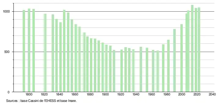 L'évolution du nombre d'habitants est connue à travers les recensements de la population effectués dans la commune depuis 1793. Pour les communes de moins de 10 000 habitants, une enquête de recensement portant sur toute la population est réalisée tous les cinq ans, les populations de référence des années intermédiaires étant quant à elles estimées par interpolation ou extrapolation[22]. Pour la commune, le premier recensement exhaustif entrant dans le cadre du nouveau dispositif a été réalisé en 2008[23].