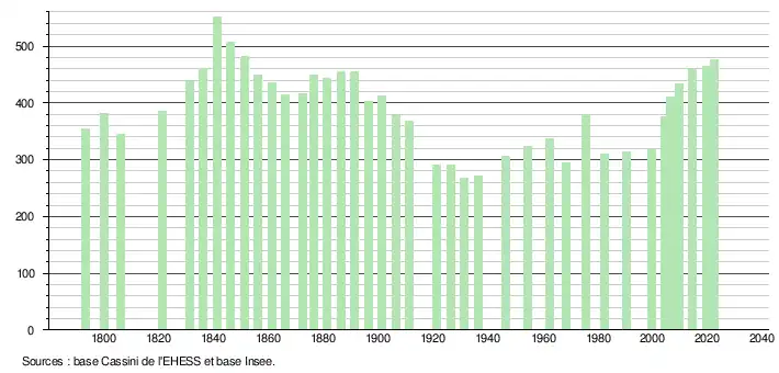 L'évolution du nombre d'habitants est connue à travers les recensements de la population effectués dans la commune depuis 1793. Pour les communes de moins de 10 000 habitants, une enquête de recensement portant sur toute la population est réalisée tous les cinq ans, les populations de référence des années intermédiaires étant quant à elles estimées par interpolation ou extrapolation[26]. Pour la commune, le premier recensement exhaustif entrant dans le cadre du nouveau dispositif a été réalisé en 2004[27].